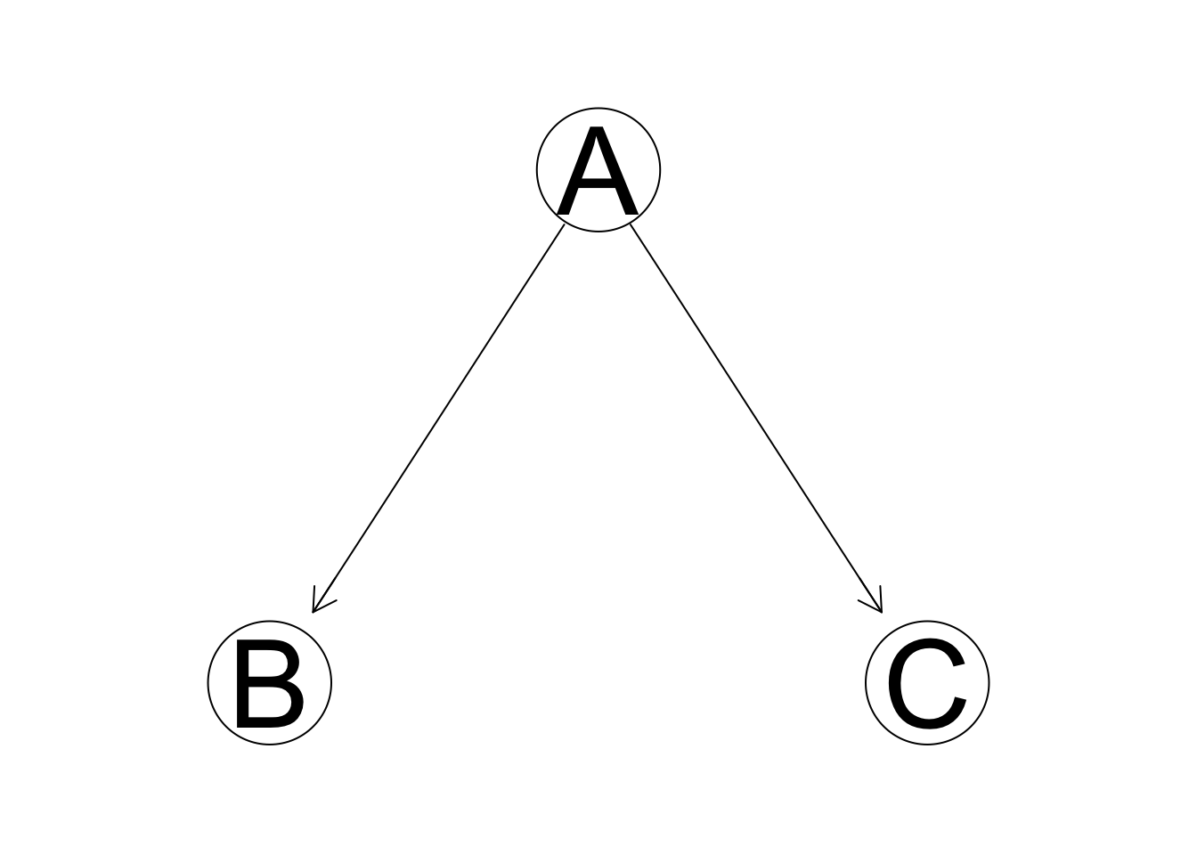 A BBN graph consists of two central elements: nodes and arcs. Each node represents a random variable, and each directed arc represents causality. Absence of arc represents (conditional) independence. An example of a BBN graph is given below.